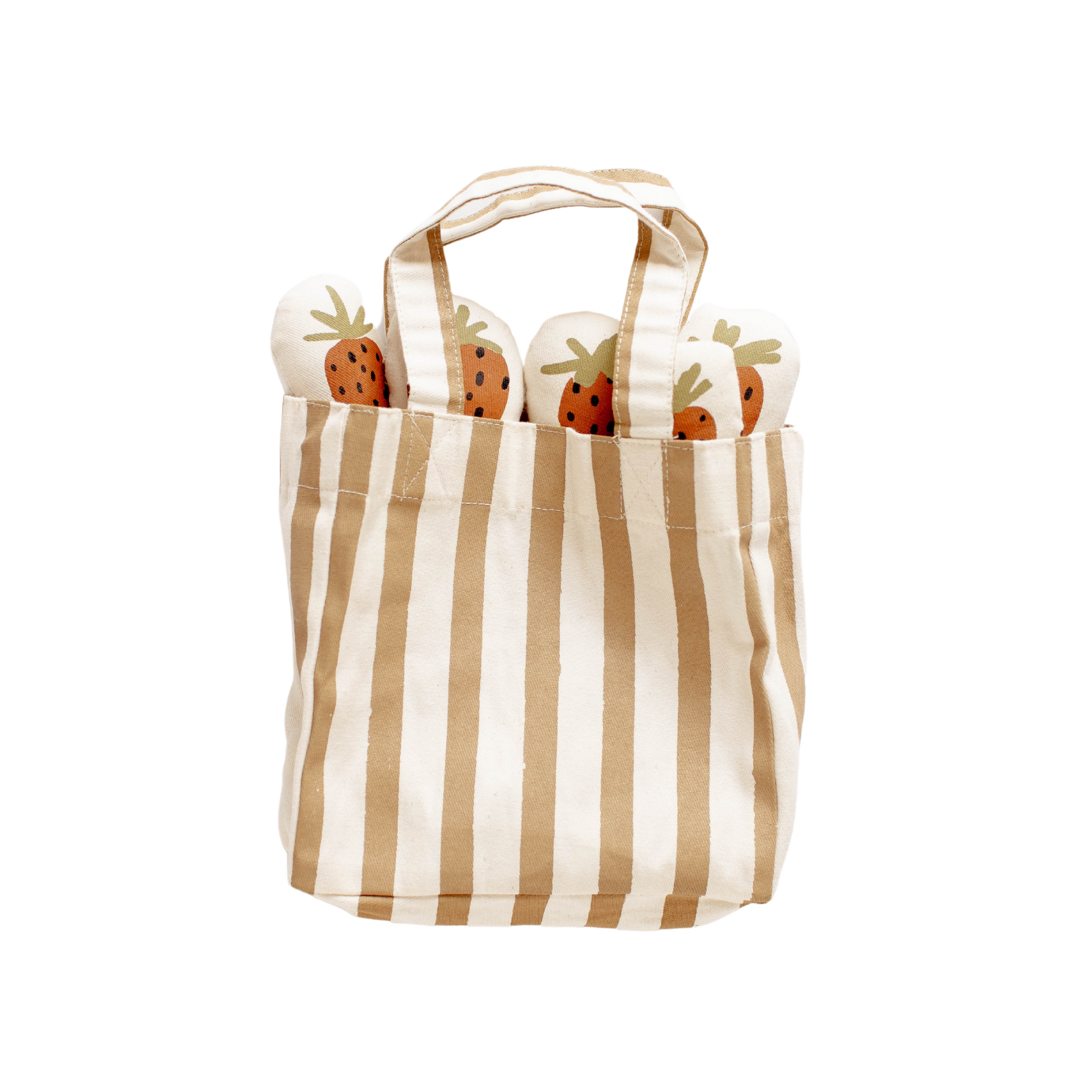 Perfect for imaginative play, our interactive strawberry tote is a great size for little hands and includes 5 hand sewn strawberries. Sewn and screen printed by hand on natural canvas by local artisans in Mombasa, Kenya.