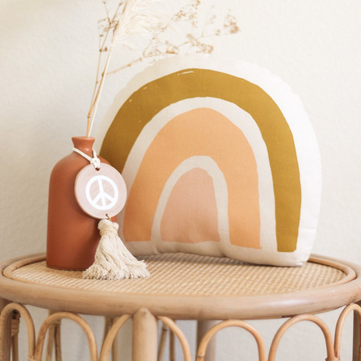 Our mod rainbow pillow is sure to bring a little magic to any space. Sewn and screen printed by hand on natural canvas by local artisans.